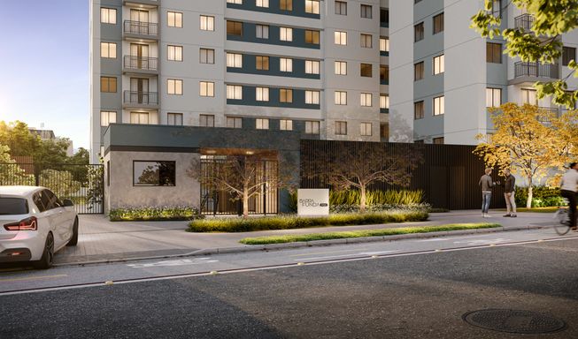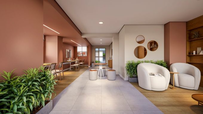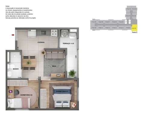A planta de 41m² com 2 dormitórios e terraço proporciona maior conforto interno e melhor circulação entre os ambientes.