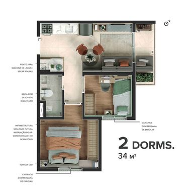 O Viva Benx Butantã representa o novo conceito de viver bem em São Paulo. Com apartamentos de 34,50m², o projeto foi pensado para quem busca exclusividade, conforto e design moderno em cada detalhe. São 2 dormitórios, 1 banheiro, varanda integrada, infraestrutura para ar-condicionado, closet, ambientes integrados e ponto para máquina lava e seca, garantindo praticidade e sofisticação em todos os espaços.