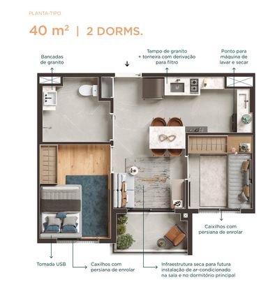 Com apartamentos de 41m², este empreendimento foi pensado para quem busca conforto, praticidade e design inteligente. São 2 dormitórios, 1 banheiro, varanda, ambientes integrados, closet e infraestrutura para ar-condicionado, criando o equilíbrio ideal entre funcionalidade e bem-estar.