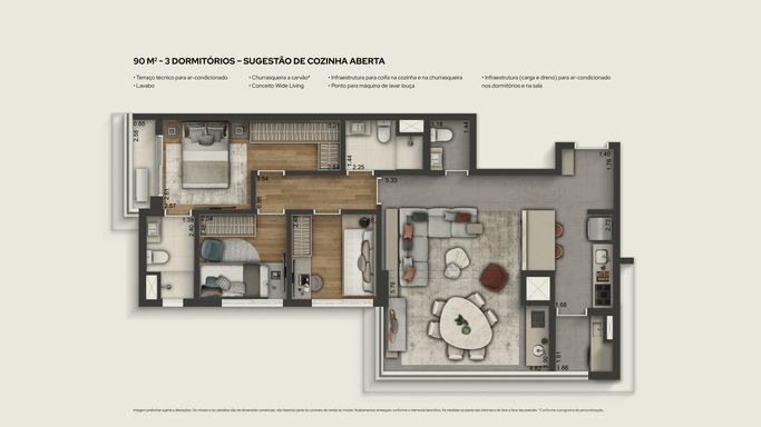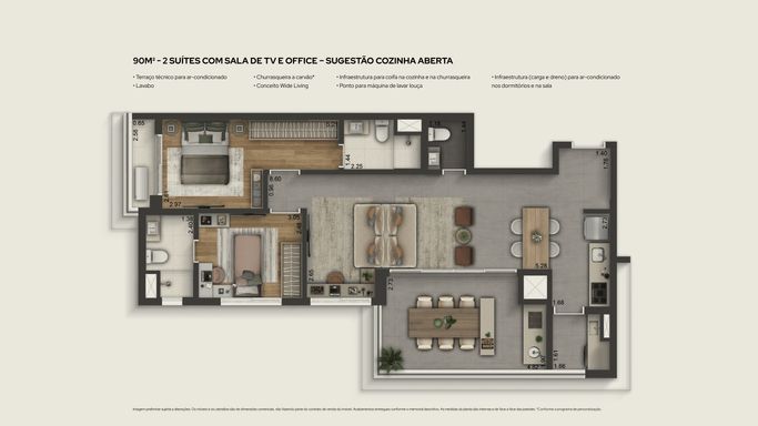 Os apartamentos de 62m² são planejados para quem valoriza o bem-estar e o estilo de vida contemporâneo. São 2 dormitórios, 2 banheiros, 1 vaga de garagem, varanda com infraestrutura para churrasqueira, cozinha gourmet, infraestrutura para ar-condicionado e ambientes integrados que criam uma sensação única de amplitude e conforto.