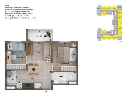 A planta de 37m² com 2 dormitórios e terraço oferece ambientes bem distribuídos e uma área externa que amplia ventilação e iluminação natural.