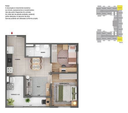 A planta de 43m² com 2 dormitórios e terraço oferece melhor aproveitamento interno e ambientes mais amplos para o dia a dia da família.