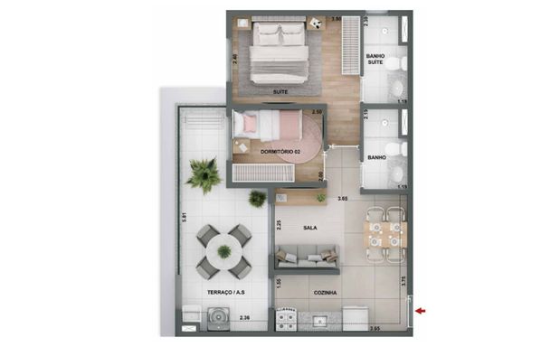 A planta de 53m² com 2 dormitórios, suíte e terraço oferece mais espaço, melhor distribuição interna e conforto para quem busca um apartamento mais completo.