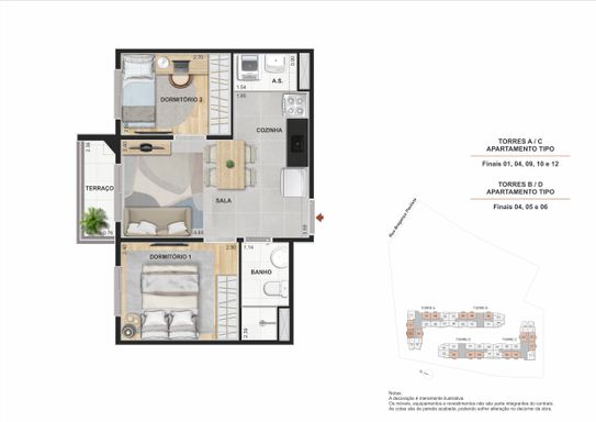 Planta equilibrada, com terraço que amplia a sensação de espaço e proporciona ventilação natural.