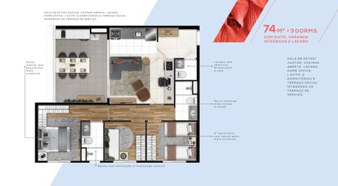 O apartamento de 74m² foi cuidadosamente planejado para oferecer funcionalidade e bem-estar. São 3 dormitórios, sendo 1 suíte, 2 banheiros, lavabo, home office, área de serviço, 1 vaga, infraestrutura para ar-condicionado e ambientes integrados que ampliam cada espaço. A varanda gourmet é o ponto alto, ideal para receber e desfrutar de momentos especiais.