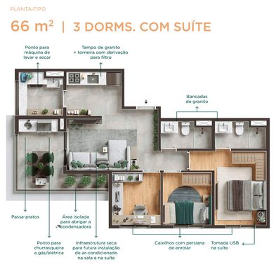 Os apartamentos de 65,59m² foram planejados para quem valoriza a exclusividade e o equilíbrio entre praticidade e sofisticação. São 3 dormitórios, 2 banheiros, varanda com churrasqueira, infraestrutura para ar-condicionado, closet e ambientes integrados que proporcionam amplitude e elegância.