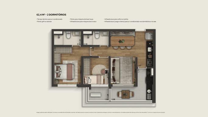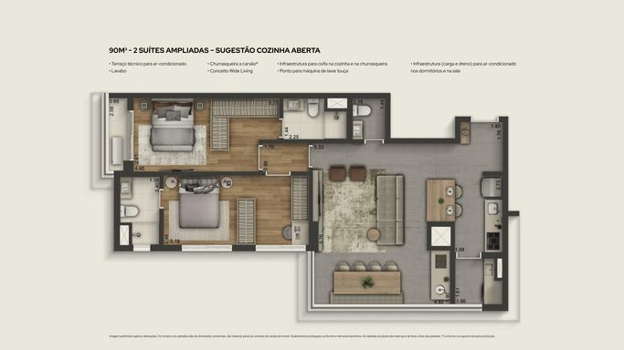 Os apartamentos de 90m² foram cuidadosamente planejados para oferecer exclusividade e bem-estar. São 3 dormitórios, 2 banheiros, varanda com churrasqueira, cozinha gourmet, ambientes integrados, infraestrutura para ar-condicionado e espaços amplos com closet. Cada detalhe foi pensado para quem valoriza o prazer de morar bem.