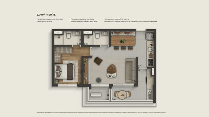E para completar, o empreendimento conta com diferenciais que facilitam o dia a dia: lavanderia, coworking, mini market, pet place e bicicletário.