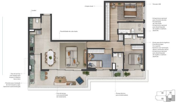 São 3 suítes amplas, 3 banheiros, lavabo, 2 vagas de garagem, cozinha planejada, varanda gourmet com churrasqueira e depósito privativo. A infraestrutura é completa, com pontos para ar-condicionado, preparo para churrasqueira e um closet espaçoso que traduz o conceito de morar bem.