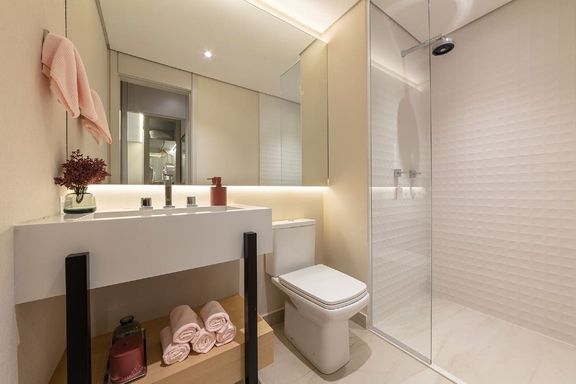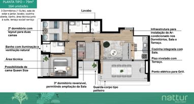 O apartamento de 79m² foi planejado para quem valoriza amplitude e integração. São 3 dormitórios, 2 banheiros, lavabo, varanda, 1 vaga, infraestrutura para ar-condicionado e ambientes integrados que tornam cada espaço mais funcional, elegante e ideal para o dia a dia.