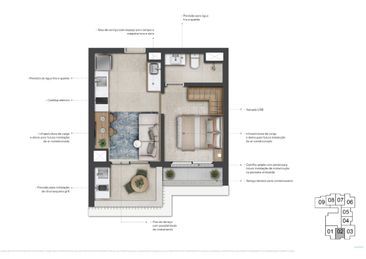 Com 1 dormitório suíte, banheiro elegante e varanda com churrasqueira, cada detalhe foi pensado para oferecer praticidade e sofisticação em perfeita harmonia. A infraestrutura para ar-condicionado e churrasqueira reforça o conforto e o estilo de vida moderno que o empreendimento proporciona.