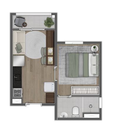 A planta de 1 dormitório entrega integração inteligente dos ambientes, ideal para rotina prática e dinâmica.