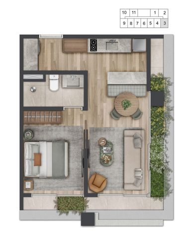Os apartamentos de 43m² traduzem o conceito do luxo contemporâneo em cada detalhe — com 1 dormitório, 1 banheiro, varanda com jardim privativo, lavabo, infraestrutura para ar-condicionado e closet, tudo pensado para oferecer praticidade e sofisticação em um só espaço.