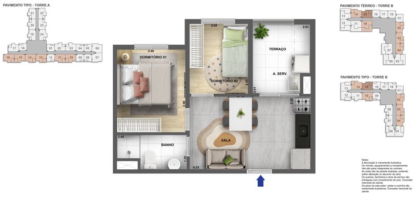 A planta de 33m² com 2 dormitórios e terraço oferece ambientes bem distribuídos e uma área externa que amplia a sensação de espaço e iluminação natural.