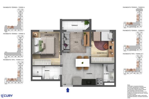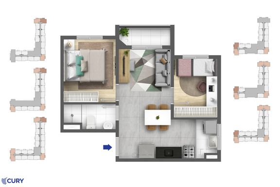 A planta de 37m² com 2 dormitórios e terraço oferece mais ventilação natural e integração com a área externa.
