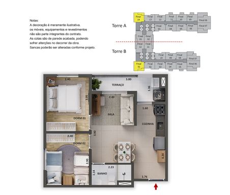 43m² – 2 Dormitórios com terraço e vaga (moto)