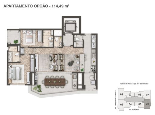O Mandarim The Legend é a expressão da sofisticação em São Paulo. São 114m² muito bem distribuídos, com três dormitórios, sendo uma suíte confortável para sua privacidade. O terraço social com churrasqueira foi pensado para momentos de descontração e convivência, enquanto as duas vagas de garagem oferecem praticidade e segurança no dia a dia. Além disso, o projeto já entrega infraestrutura para ar-condicionado, garantindo conforto em todas as estações.